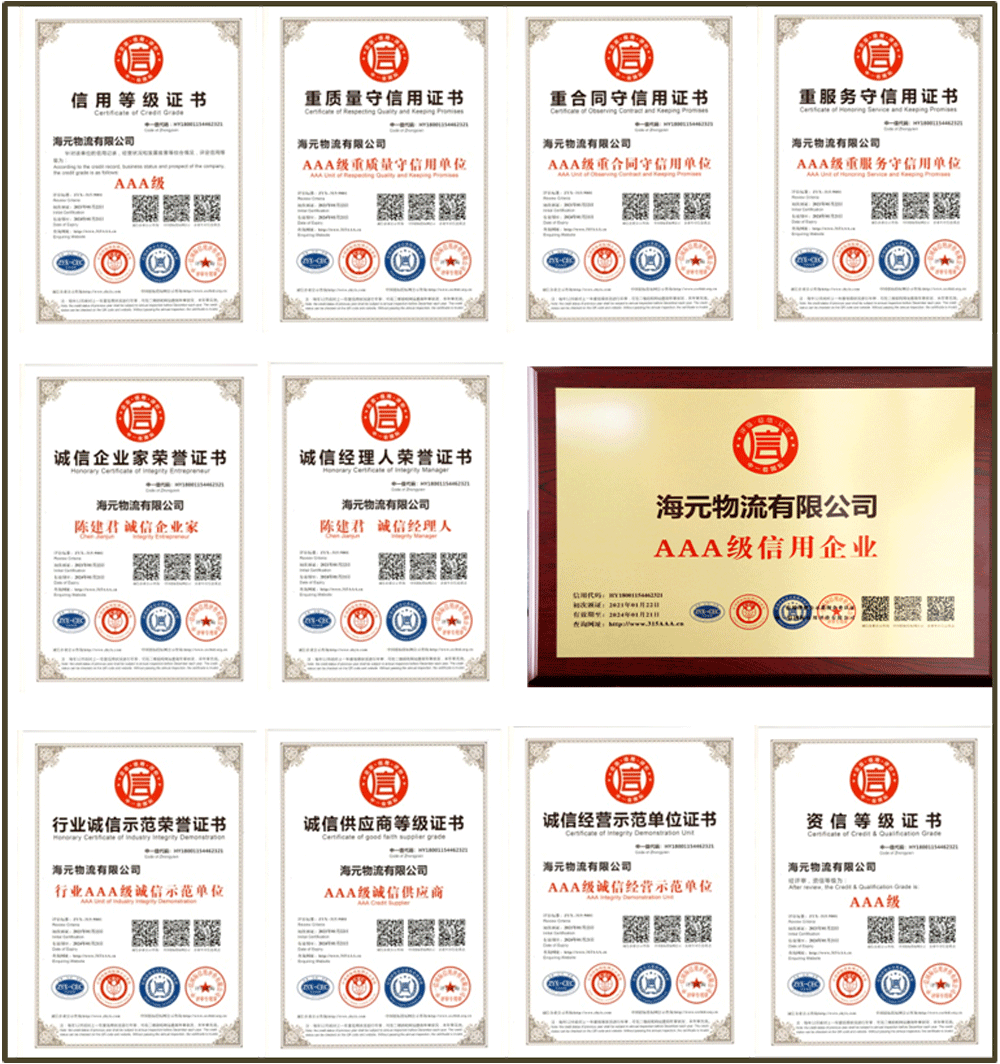在2021年新年来临之际,海元物流喜获十大荣誉证书: